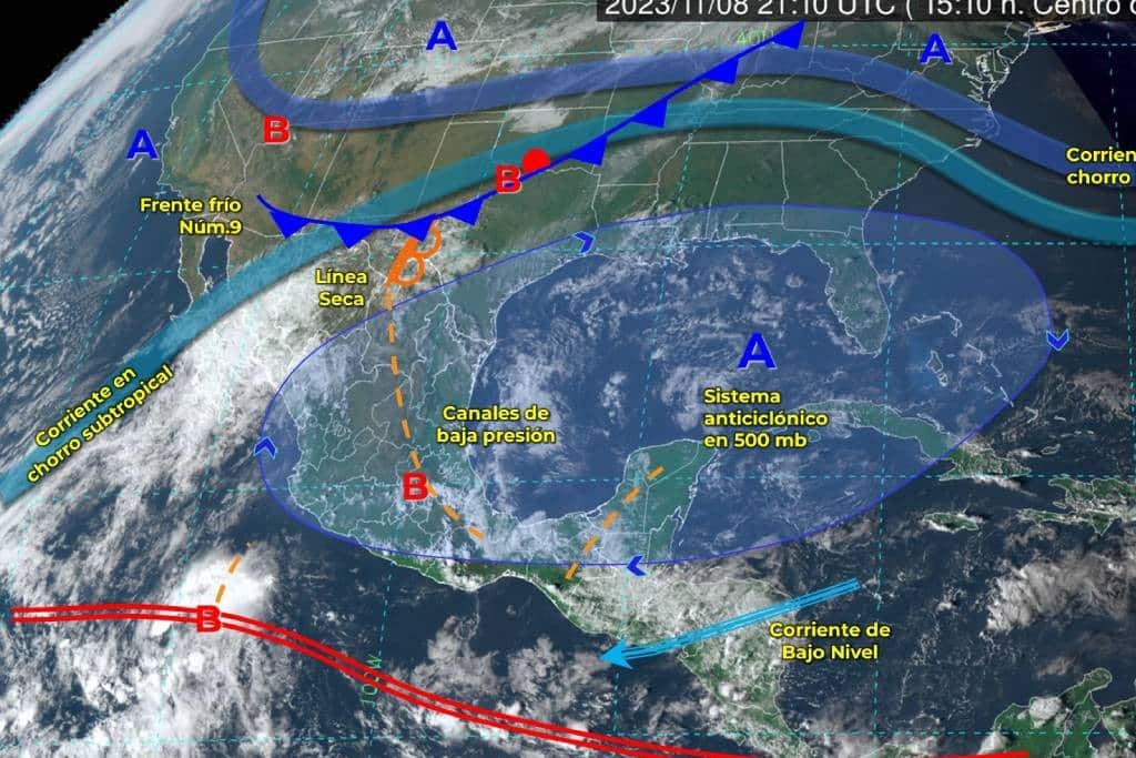 El frente frío Núm. 9 recorrerá el norte del país e interaccionará con la corriente en chorro subtropical en niveles altos de la atmósfera y en superficie con un canal de baja presión sobre el noreste del país, producirán chubascos con lluvias puntuales muy fuertes en Coahuila, Nuevo León y Tamaulipas, y fuertes en Chihuahua y Durango. Además, se prevén viento con rachas de 60 a 80 km/h y posible formación de torbellinos o tornados en Coahuila, Nuevo León y Tamaulipas. Dichas lluvias se acompañarán de tormentas eléctricas y posible caída de granizo.