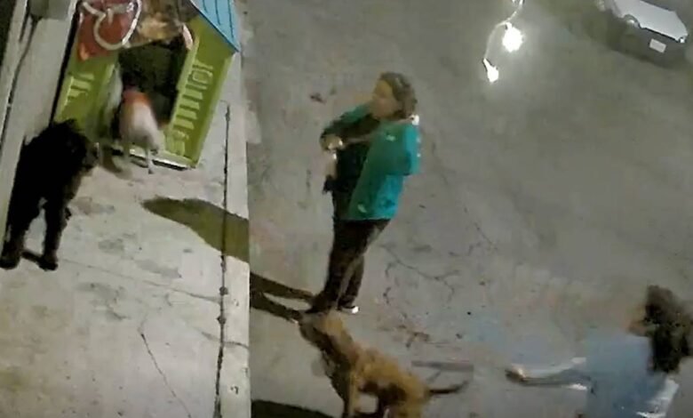 En el video aparece el primer lomito sobre la calle, al cual uan de las señoras le arroja lo que pudiera ser una piedra, seguido de esto sale el otro perro en defensa de este, la señora que le avienta el objeto regresa por el primer animalito.
