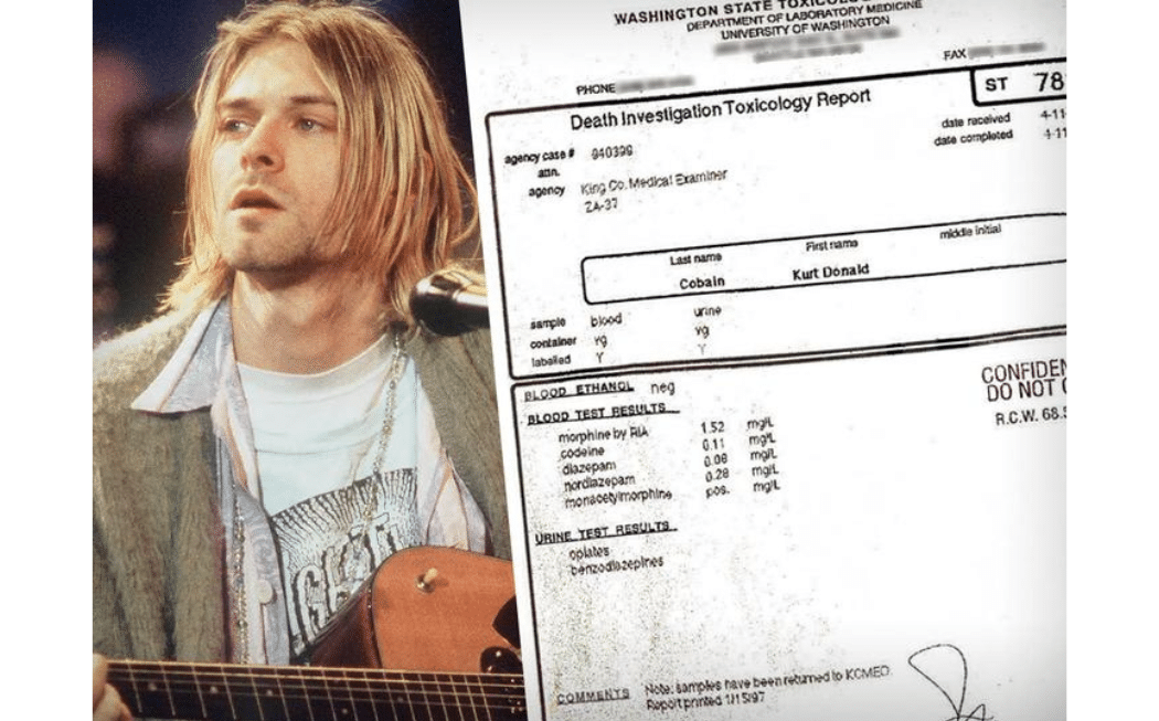 A continuación, adjuntó nueve páginas adicionales de lo que, según Grant, sería el informe de la autopsia de Cobain. En el informe toxicológico, los exámenes de sangre arrojaron morfina, codeína, diazepam, nordiazepam y monacelimorfina en el cuerpo del cantante al momento de su muerte.