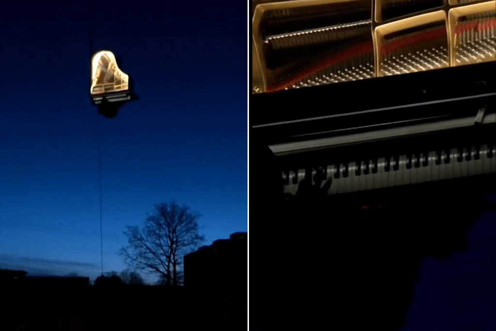 Alain Roche toca el piano colgado de una grúa a 10 metros de altura