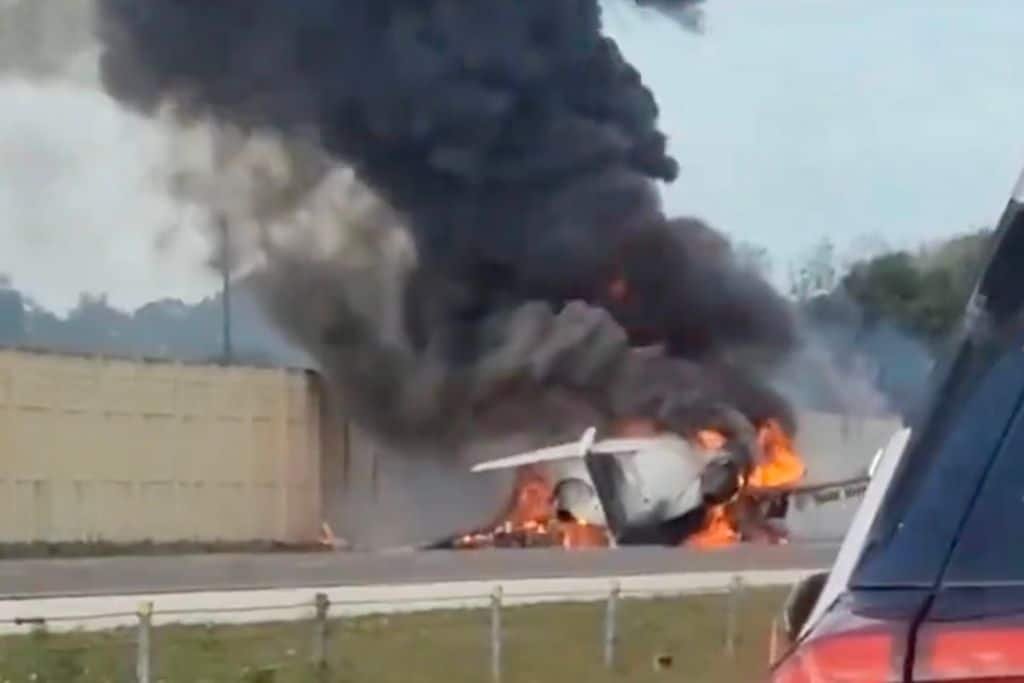 Automovilistas presentes en la autopista capturaron videos del avión en llamas mientras continuaba ardiendo.