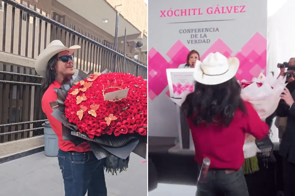 Imitador de “El Patrón” regala ramo “buchón” a Xóchitl Gálvez