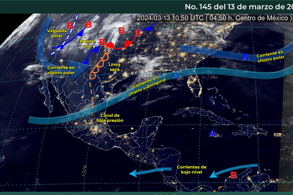 Por otra parte, esta noche y primeras horas del jueves, un frente frío se aproximará al norte del país, se asociará con una vaguada polar y con la corriente en chorro polar, originando lluvias aisladas en Baja California, además de descenso de temperaturas y rachas de hasta 70 km/h y tolvaneras en dicha región.