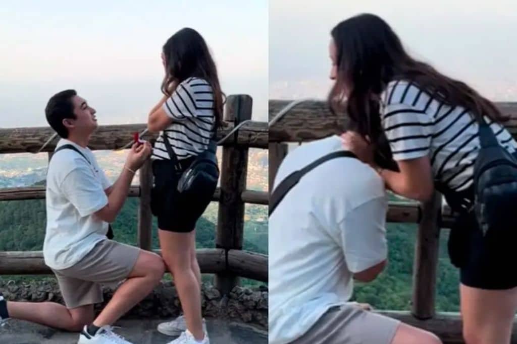La emoción invadió a la mujer, quien llevó sus manos a la boca en incredulidad. Sin embargo, cuando bajó los brazos para aceptar la propuesta y abrazar a su prometido, un movimiento accidental hizo que la caja con el anillo cayera al barranco.