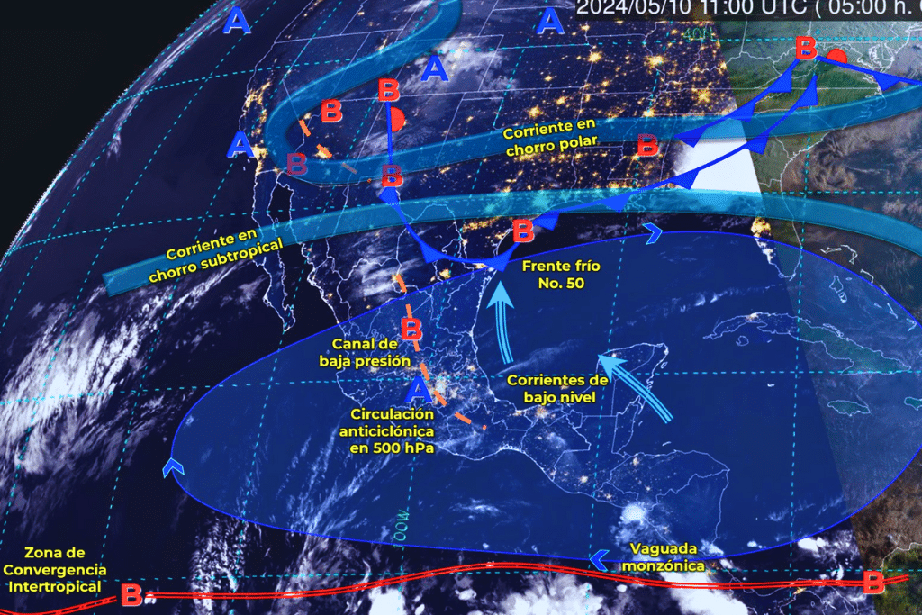 Durante este viernes, el frente frío No. 50 se extenderá sobre el norte y noreste de México, en interacción con un canal de baja presión sobre el noreste del país y con la corriente en chorro subtropical, ocasionará lluvias puntuales fuertes con descargas eléctricas y posible caída de granizo, así como viento con rachas fuertes y posible formación de torbellinos o tornados en Coahuila, Nuevo León y Tamaulipas. La masa de aire frío que impulsa al sistema frontal propiciará un refrescamiento en las temperaturas en el norte y noreste del territorio nacional. Canales de baja presión sobre el centro, sureste y Península de Yucatán, aunado al ingreso de humedad procedente del Océano Pacífico y Golfo de México, ocasionarán lluvias y chubascos acompañados de descargas eléctricas y posible caída de granizo en dichas regiones. Finalmente, una circulación anticiclónica en niveles medios de la atmósfera mantendrá la segunda onda de calor de la temporada sobre la República Mexicana, con temperaturas superiores a 45 °C en Sinaloa, Michoacán, Guerrero, Oaxaca, Chiapas, Tamaulipas, San Luis Potosí, Veracruz, Tabasco, Campeche y Yucatán.