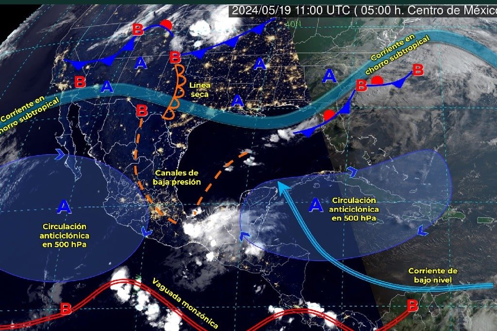 Un canal de baja presión sobre el sureste mexicano aunado al ingreso de humedad del Océano Pacífico, Golfo de México y Mar Caribe, ocasionará lluvias puntuales muy fuertes en Oaxaca y Chiapas, además de chubascos y lluvias fuertes en Guerrero, Puebla, Veracruz, Tabasco y Campeche. Por otra parte, una línea seca en el norte de la República Mexicana en interacción con un canal de baja presión sobre la Mesa del Norte y la Mesa Central y con aire inestable superior, producirán lluvias y chubascos vespertinos en el noreste, occidente, centro y oriente del territorio nacional, incluido el Valle de México. Las lluvias mencionadas podrán estar acompañadas de descargas eléctricas, rachas fuertes de viento y posible caída de granizo. Finalmente, una circulación anticiclónica en niveles medios de la atmósfera se establecerá sobre el occidente de México, generando temperaturas superiores a 40 °C en 24 entidades del país.