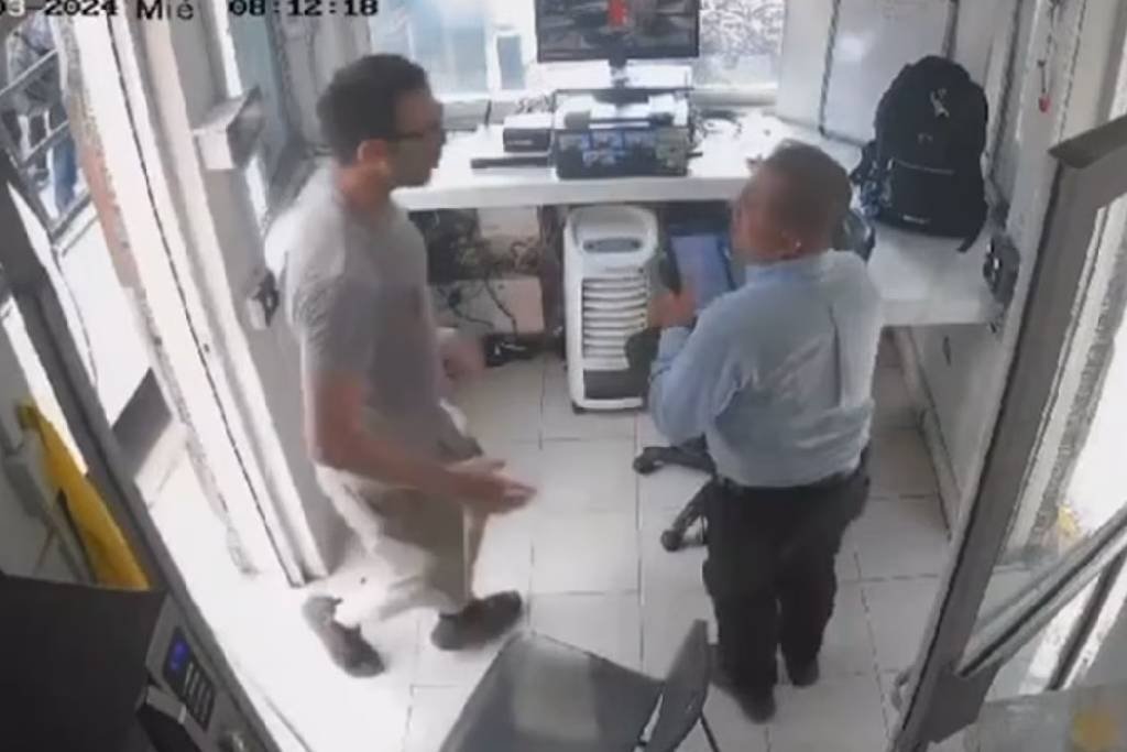 En los videos se observa como el hombre llega en su vehículo y se pasa la pluma de acceso, dañando la infraestructura. Posteriormente, desciende su automóvil y se dirige a la caseta de seguridad para comenzar la agresión.