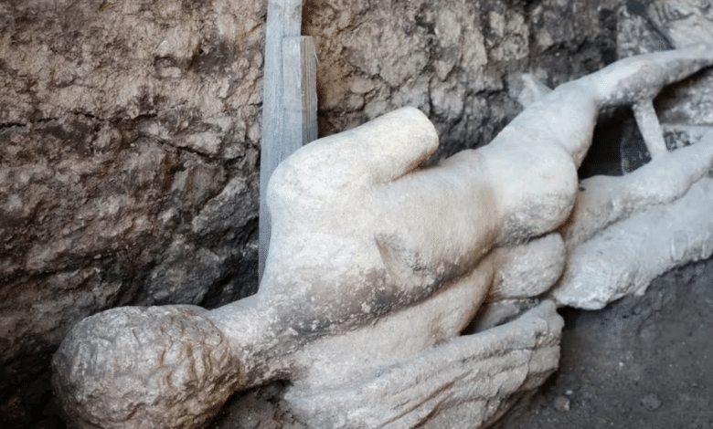 El brazo izquierdo de la estatua, envuelto en tela, aún no ha sido completamente excavado. Las primeras evaluaciones indican que tiene paralelos con otras representaciones del dios Hermes, un tipo iconográfico conocido, pero cuya conservación es un hecho raro.