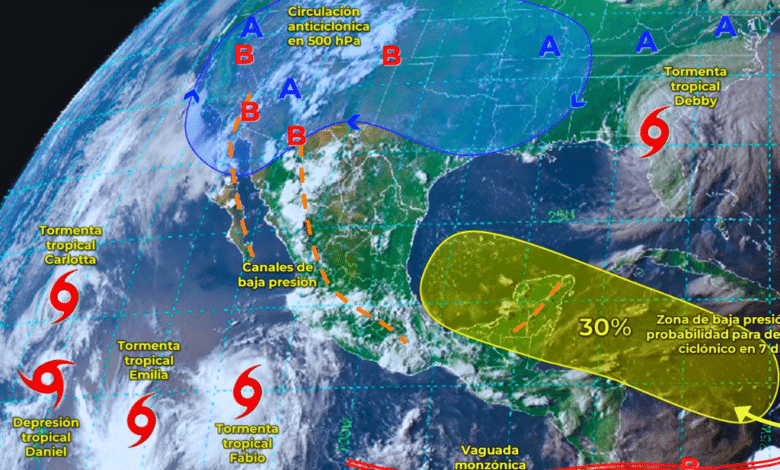 Por otra parte, el monzón mexicano, en combinación con inestabilidad en niveles altos de la atmósfera generará lluvias puntuales muy fuertes acompañadas de descargas eléctricas y probabilidad de caída de granizo en Sonora, Chihuahua, Durango y Sinaloa, así como intervalos de chubascos en Baja California y Baja California Sur, además de rachas de viento de 50 a 70 km/h y tolvaneras en Baja California, Sonora y Chihuahua, así como rachas de 40 a 60 km/h en Baja California Sur y Durango.