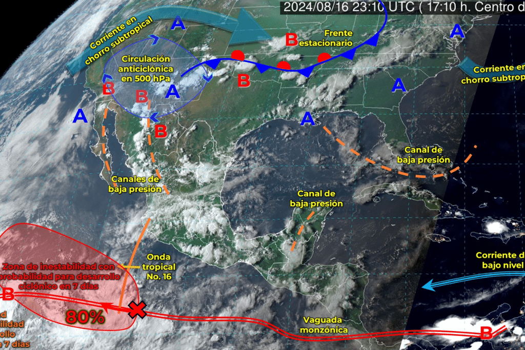La onda tropical No. 16 se desplazará sobre Jalisco y Colima, en interacción con un canal de baja presión extendido sobre el occidente y centro del territorio mexicano, ocasionarán lluvias fuertes a puntuales muy fuertes en las regiones mencionadas, además del sur del país y el Valle de México; con lluvias puntuales intensas en Nayarit, Jalisco, Colima, Michoacán, Guanajuato, Guerrero y Oaxaca. A su vez, la zona de baja presión con probabilidad para desarrollo ciclónico, en asociación con la onda tropical No. 16, se localizará al sur de las costas de Colima y Jalisco, intensificándose gradualmente. Por otra parte, el monzón mexicano originará lluvias fuertes a puntuales muy fuertes acompañadas con descargas eléctricas, rachas de viento y posible caída de granizo en el noroeste del país; así como lluvias aisladas y chubascos en la península de Baja California.