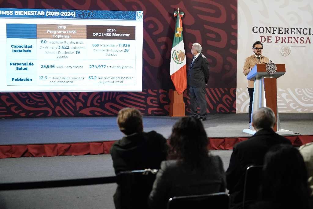 En la conferencia de Pulso de la Salud número 176, encabezada por el presidente en Palacio Nacional, Zoé Robledo expuso que desde la firma del acuerdo para la implementación de IMSS-Bienestar, el 10 de octubre de 2023, pasó de una capacidad instalada de 80 a 660 hospitales; de tres mil 622 Unidades Médicas Rurales (UMR) a 11 mil 935 centros de salud, y de una plantilla laboral de 23 mil 967 trabajadores a 274 mil 977.