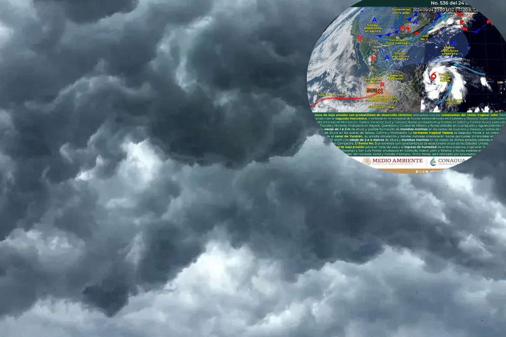 Pacífico Sur: Cielo nublado la mayor parte el día. Por la mañana ambiente fresco, templado en zonas costeras y frío con bancos de niebla en zonas serranas. Lluvias y chubascos matutinos. Durante la tarde, ambiente cálido, y templado a fresco en zonas altas. Lluvias puntuales extraordinarias en Guerrero y Oaxaca, y torrenciales en Chiapas; todas con posibles descargas eléctricas, las cuales podríanocasionar deslaves, inundaciones y encharcamientos, así como incrementar los niveles de ríos y arroyos. Viento de dirección variable de 15 a 30 km/h en la región; con rachas de 70 a 90 km/h, oleaje de 2 a 4 m de altura y la posible formación de trombas marinas en las costas de Guerrero y Oaxaca.