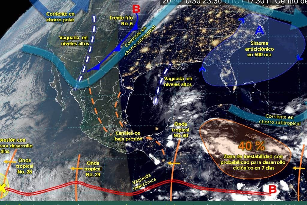 Durante la noche y madrugada del jueves, el frente frío No. 6 se desplazará sobre el norte de México, en interacción con la corriente en chorro subtropical ocasionarán rachas de viento de 60 a 80 km/h y posible formación de torbellinos en Chihuahua y rachas de viento de 40 a 60 km/h con posible formación de torbellinos en Coahuila, Nuevo León y Tamaulipas, además de lluvias aisladas en Coahuila. A su vez, prevalecerá el ambiente frío a muy frío durante la mañana y noche sobre entidades del noroeste y norte del país. La onda tropical No. 30 se moverá sobre la península de Yucatán y el sureste mexicano, en interacción con un canal de baja presión y una vaguada superior sobre el golfo de México, producirán lluvias puntuales intensas en Yucatán y Quintana Roo; lluvias muy fuertes en Campeche y lluvias fuertes en Guerrero, Oaxaca y Chiapas, además vientos de 40 a 60 km/h en las entidades de la Península de Yucatán, todas las lluvias mencionadas se podrán acompañar de descargas eléctricas y posible caída de granizo. Canales de baja presión en interacción con el ingreso de humedad del océano Pacífico y golfo de México originarán intervalos de chubascos en Tamaulipas, Michoacán, Estado de México, Morelos, Tlaxcala, Puebla, Veracruz y Tabasco, y lluvias aisladas en Nuevo León, San Luis Potosí, Jalisco, Colima, Guanajuato, Querétaro, Hidalgo y Ciudad de México. La onda tropical No. 29 ha dejado de afectar al país.