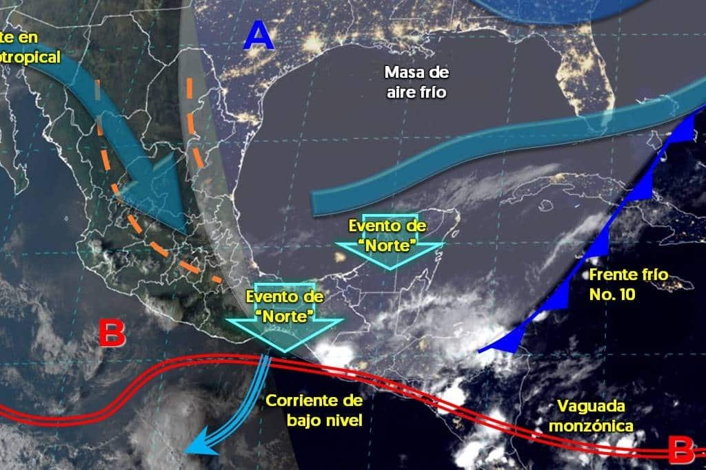 Durante esta noche y madrugada del viernes, lamasa de aire frío asociada al frente No. 10, mantendrá el evento de “Norte” de 40 a 60 km/h con rachas de 80 a 100 km/h en el istmo y oleaje de 3 a 5 metros de altura en el golfo de Tehuantepec, de 30 a 40 km/h con rachas de 60 a 80 km/h en el litoral sur de Veracruz y de 15 a 25 km/h con rachas de 40 a 60 km/h en las costas de Tabasco y el litoral de la península de Yucatán, así como oleaje de 2 a 3 metros de altura en las costas de los mencionados estados. A su vez, continuará el ambiente frío a muy frío en el noroeste, norte, noreste, centro y oriente de la República Mexicana, con ambiente gélido en zonas altas de Chihuahua y Durango; también mantendrá los bancos de niebla sobre el oriente y sureste mexicano. Además de mantener la probabilidad para la caída de nieve y/o aguanieve en las cimas de los volcanes Popocatépetl, Iztaccíhuatl, Pico de Orizaba y Nevado de Toluca. La interacción de la masa de aire frío con los desprendimientos nubosos de la vaguada monzónica, originará lluvias puntuales muy fuertes en Oaxaca y Chiapas, lluvias fuertes en la región sur de Veracruz y Tabasco, chubascos en Puebla y Campeche, y lluvias aisladas en Yucatán y Quintana Roo. Por su parte, el frente No. 10 se extiende sobre el mar Caribe y ha dejado de afectar al país. Por otro lado, un canal de baja presión sobre el occidente de la República Mexicana aunado al ingreso de humedad del océano Pacífico, producirán lluvias puntuales fuertes con descargas eléctricas en Guerrero, chubascos en Jalisco, Colima, Michoacán y Estado de México y lluvias aisladas en Zacatecas, Aguascalientes, Guanajuato, Ciudad de México, Morelos y Tlaxcala. Se espera oleaje de 1 a 3 metros de altura en la costa occidental de la península de Baja California.