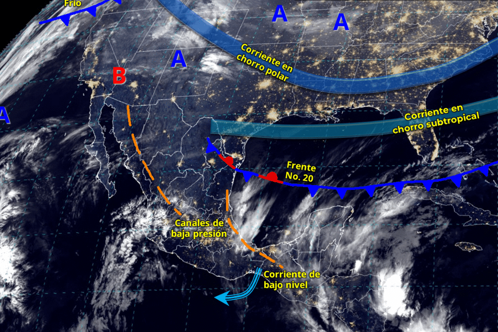 Para este día, el frente No. 20 se extenderá con características de estacionario desde el oriente del golfo de México hasta el noreste del país; interaccionará con un canal de baja presión sobre el oriente y sureste mexicano, con la corriente en chorro subtropical y con la entrada de humedad del océano Pacífico, Golfo de México y Mar Caribe, propiciando lluvias con intervalos de chubascos en las regiones mencionadas, pronosticándose lluvias puntuales fuertes en zonas de Tamaulipas y la península de Yucatán, así como lluvias puntuales muy fuertes en Veracruz, Oaxaca, Chiapas y Tabasco.