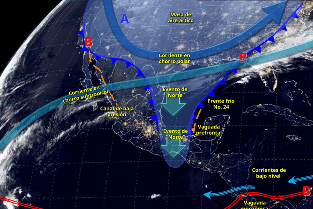 Hoy el frente frío No. 24 se desplazará sobre el oriente y sureste del país, posteriormente alcanzará la península de Yucatán, interaccionará con la corriente en chorro subtropical, ocasionando lluvias fuertes a puntuales muy fuertes en las mencionadas regiones, así como chubascos y lluvias aisladas en San Luis Potosí, Querétaro, Hidalgo, Tlaxcala y Campeche. Por su parte, la masa de aire ártico asociada al frente, mantendrá la onda fría con descenso de temperaturas en estados del norte y noreste del territorio mexicano, presentándose ambiente gélido en sierras de Chihuahua, Durango y Coahuila.
