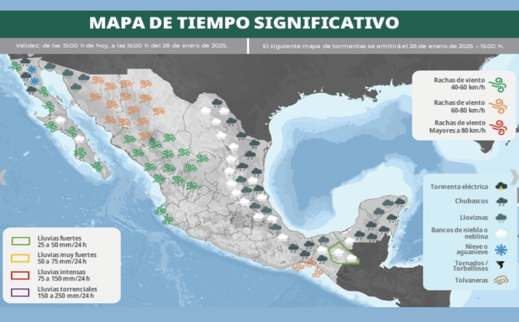 Por otra parte, el frente No. 25, en interacción con una circulación ciclónica en niveles medios y altos de la atmósfera, además del ingreso de humedad generado por la corriente en chorro subtropical, originarán lluvias aisladas en el noroeste, norte y noreste de la República Mexicana, ambiente muy frío a gélido en zonas montañosas de Baja California, Sonora, Chihuahua y Durango, con probable caída de nieve, aguanieve o lluvia engelante en el norte de Sonora, así como en las sierras de Juárez y San Pedro Mártir, B.C.