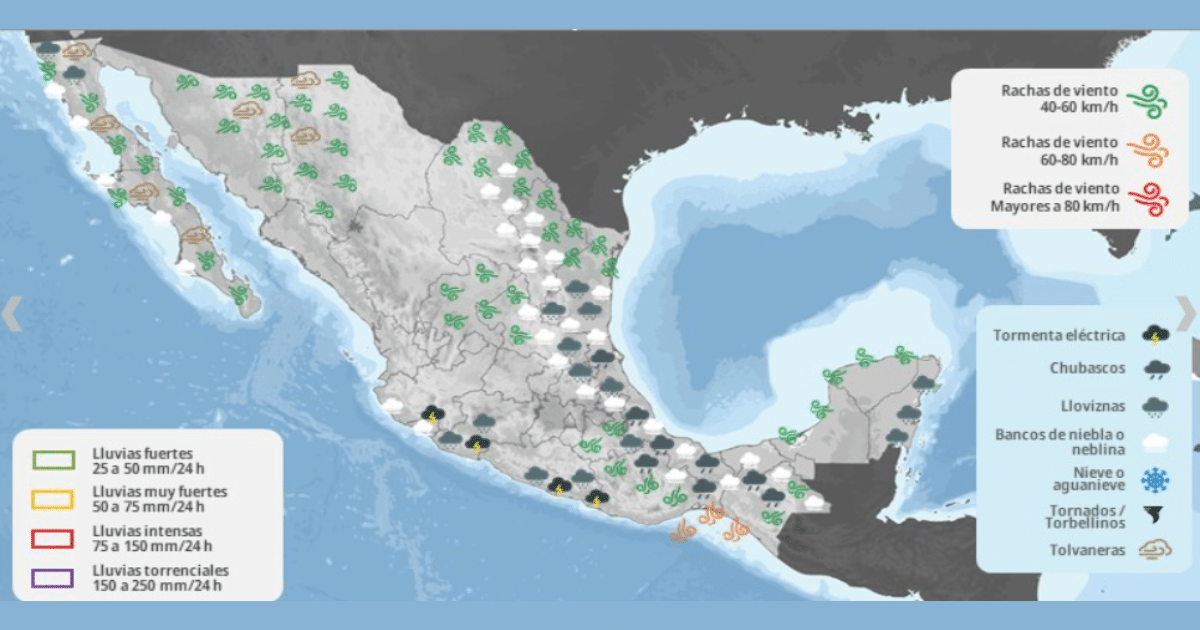 Asimismo, en el transcurso de la tarde, el sistema frontal entrará en etapa de disipación sobre el noroeste de la República Mexicana. Finalmente, canales de baja presión sobre el occidente, oriente y sureste del país, en interacción con la humedad proveniente del océano Pacífico, golfo de México y mar Caribe, generarán lluvias y chubascos dispersos en dichas regiones, además de la península de Yucatán.