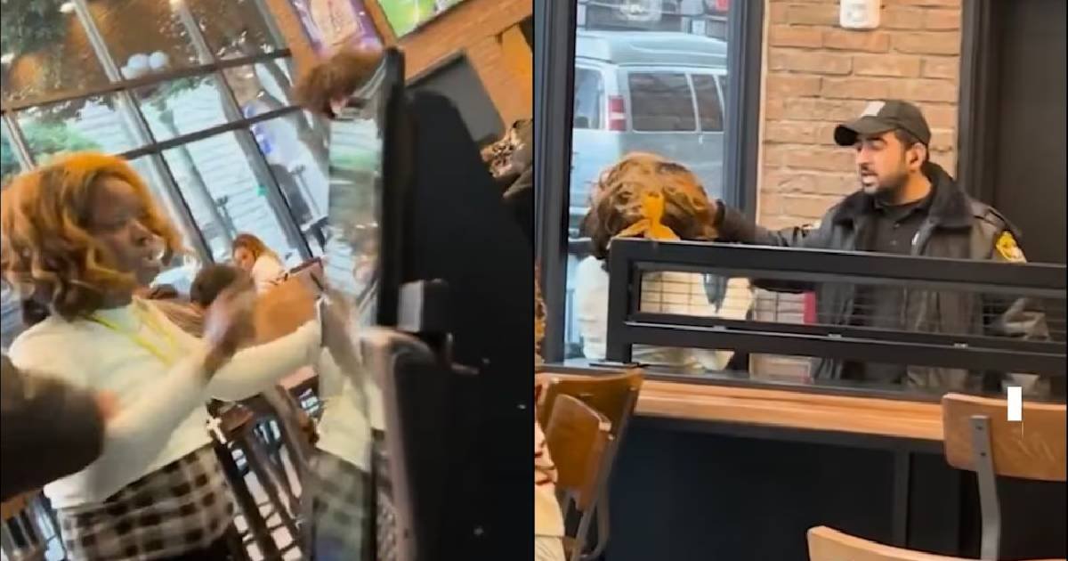 La mujer no identificada y el guardia de seguridad parecen estar en una especie de altercado. Luego, ella se acercó a la pantalla de pedidos digitales y, cuando comenzó a escribir, el guardia de seguridad la apartó y de inmediato le dio una bofetada en la cara.