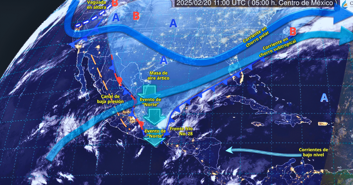 Para hoy, el frente frío No. 28 se extenderá sobre el sur del golfo de México y la península de Yucatán, y originará lluvias puntuales torrenciales en Veracruz, Tabasco y Chiapas, lluvias puntuales intensas en Oaxaca y lluvias puntuales muy fuertes en Campeche, Yucatán y Quintana Roo. La masa de aire ártico asociada al sistema frontal, mantendrá ambiente gélido al amanecer en el norte del territorio nacional y frío a fresco por la tarde en el noreste, oriente y centro del país, así como evento de “Norte” fuerte a intenso en el litoral del golfo de México, istmo y golfo de Tehuantepec, además de la península de Yucatán, además aunado a la entrada de humedad generada por la corriente en chorro subtropical, existen condiciones para la caída de aguanieve o nieve en cimas montañosas con altitudes superiores a 4200 msnm del centro y oriente del país (Pico de Orizaba, Popocatépetl, Iztaccíhuatl, Malinche, Sierra Negra y Nevado de Toluca).