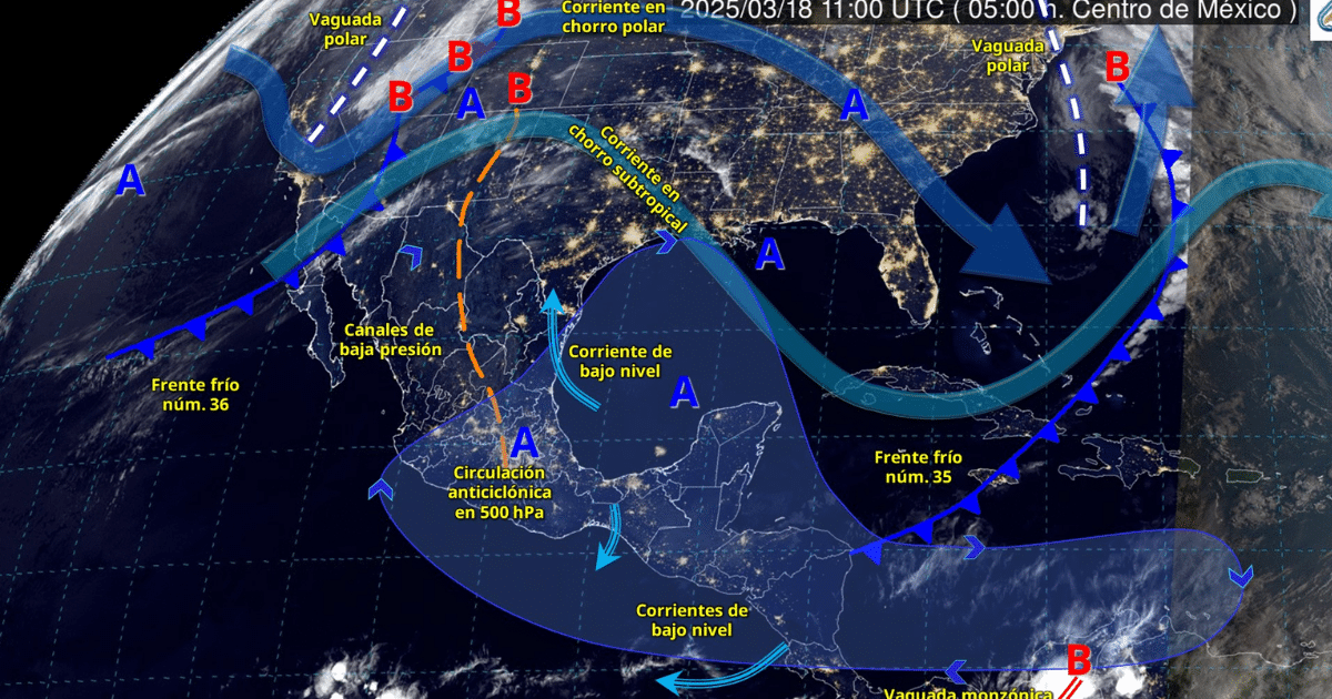 Para hoy, el frente frío núm. 36 recorrerá el noroeste y norte del territorio mexicano en interacción con las corrientes en chorro polar y subtropical, y en combinación con un canal de baja presión extendido sobre el noreste del país, ocasionarán vientos con rachas de 90 a 110 km/h en zonas de Chihuahua, rachas de 70 a 90 km/h en zonas de Sonora y Durango y rachas de 60 a 80 km/h en zonas de Baja California Sur y Coahuila, además de descenso de temperatura en el noroeste y norte del territorio nacional. Por otra parte, la masa de aire asociada con el frente núm. 35 modificará sus características térmicas, debido a un evento de surada (viento de componente sur) en Nuevo León, Tamaulipas y Veracruz. Finalmente, una circulación anticiclónica en niveles medios de la atmósfera mantendrá tiempo estable, baja probabilidad de lluvia y ambiente vespertino cálido a caluroso en gran parte del territorio mexicano, así como ambiente muy caluroso con temperaturas máximas de 40 a 45 °C en zonas de Coahuila, Guerrero, Oaxaca y Chiapas.