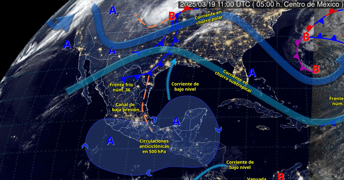 Durante este día, el frente frío núm. 36 se desplazará sobre el noreste y oriente del país, y en interacción con un canal de baja presión sobre el sureste de la República Mexicana y con las corrientes en chorro polar y subtropical, originará lluvias e intervalos de chubascos en el noreste, centro, oriente y sureste de México; así como vientos fuertes a muy fuertes en el noroeste, norte, noreste, oriente y centro del territorio nacional.