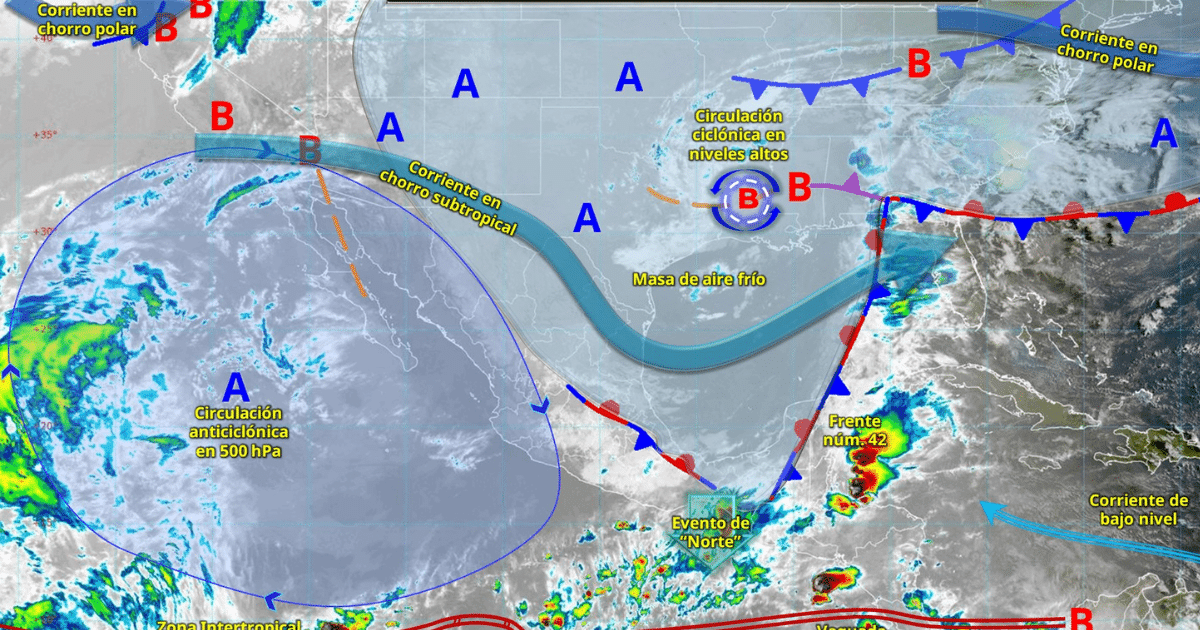 La masa de aire frío asociada al frente modificará sus características térmicas en el transcurso del día, favoreciendo el ascenso gradual de las temperaturas en el norte, noreste, oriente y centro del territorio mexicano; sin embargo, se mantendrá el evento de “Norte” con rachas de viento de 70 a 90 km/h en el istmo y golfo de Tehuantepec (Oaxaca y Chiapas), y viento de componente norte de 40 a 60 km/h en Veracruz, Tabasco y Campeche.
