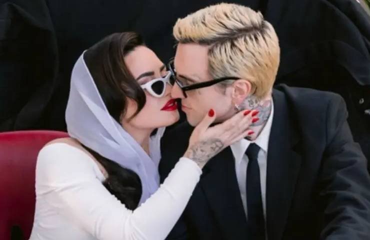 Demi deslumbró con un vestido de novia personalizado de Vivienne Westwood en tono blanco perla y un velo de catedral. Durante la fiesta, cambió a un vestido de seda con perlas para el banquete y luego a un conjunto exclusivo para la fiesta posterior.