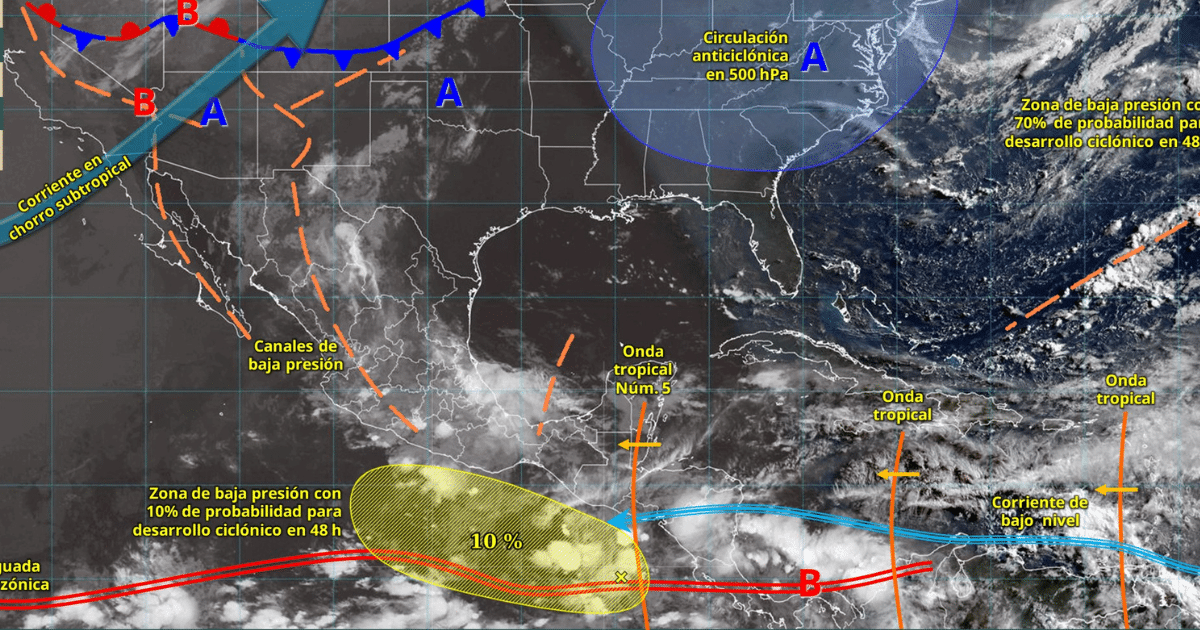 Este día, se mantendrá el temporal de lluvias sobre gran parte de la República Mexicana, debido a canales de baja presión que en combinación con inestabilidad atmosférica y el ingreso de humedad de ambos océanos, además de la proximidad de la vaguada monzónica y de la onda tropical núm. 5, asociada con una zona de baja presión con probabilidad para desarrollo ciclónico al sur de El Salvador; originarán chubascos y lluvias fuertes a muy fuertes sobre la Mesa del Norte, el occidente, centro, noreste, oriente, sur y sureste del territorio nacional, incluida la península de Yucatán, así como lluvias puntuales intensas en Jalisco, Colima, Michoacán, Guerrero, Puebla, Oaxaca, Chiapas y Veracruz. Por otra parte, el patrón de circulación tipo monzón prevalecerá sobre el noroeste de México, generando lluvias fuertes a muy fuertes acompañadas con descargas eléctricas y posibles granizadas en dicha región; con lluvias puntuales intensas en Chihuahua y Durango. Finalmente, continuará el ambiente caluroso a muy caluroso sobre entidades del noroeste y norte del territorio mexicano, además de la península de Yucatán, con temperaturas superiores a 40 °C en Baja California (noreste), Sonora y Sinaloa (norte).