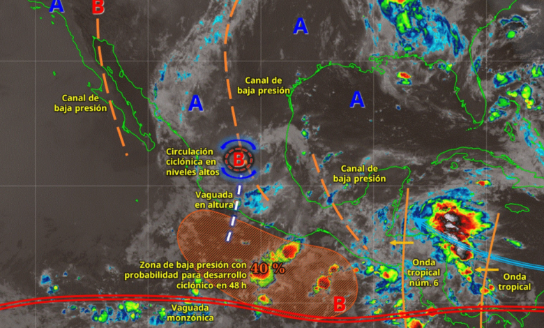 Para hoy, una zona de baja presión con probabilidad para desarrollo ciclónico al sur del golfo de Tehuantepec, en interacción con un canal de baja presión en el sureste del país y con el ingreso de aire húmedo del océano Pacífico, ocasionarán lluvias puntuales intensas en Oaxaca (norte y noreste) y Chiapas (noroeste, sur y este). La onda tropical núm. 6 que se desplazará sobre la península de Yucatán y el ingreso de aire húmedo del mar Caribe, generarán lluvias puntuales intensas en Tabasco (sur y este) y Veracruz (sur); y puntuales muy fuertes en Campeche, Yucatán y Quintana Roo.
