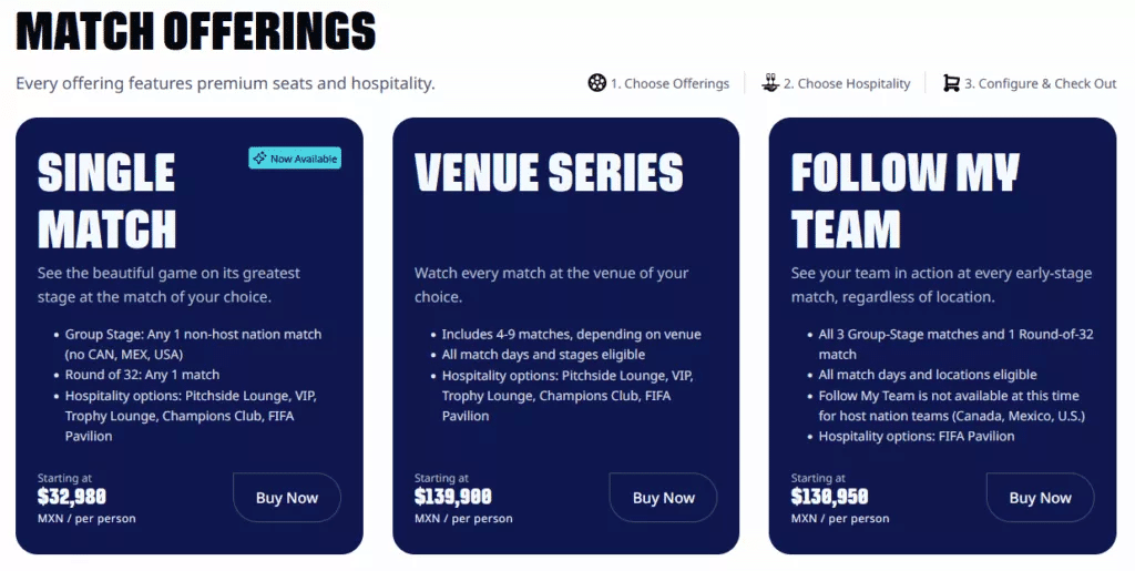 Hasta el momento, la venta es exclusiva para paquetes hospitality. La FIFA aún no ha liberado entradas generales ni boletos específicos para los partidos de selecciones anfitrionas como México, Estados Unidos y Canadá.
