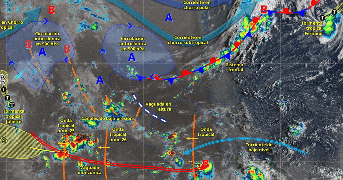 Para hoy, el monzón mexicano en interacción con una circulación ciclónica en niveles medios de la atmósfera sobre el sur del golfo de California y con inestabilidad atmosférica, generarán lluvias puntuales intensas en Sonora, Chihuahua y Sinaloa; muy fuertes en Durango; lluvias fuertes en Baja California Sur y Nayarit, y chubascos en Baja California.