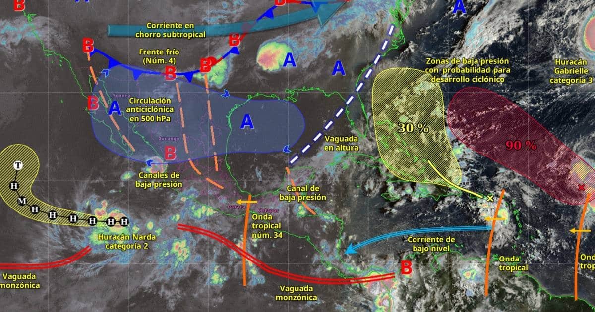 Un canal de baja presión y una vaguada en altura sobre la península de Yucatán, generarán lluvias puntuales muy fuertes en Yucatán y Campeche; y puntuales fuertes en Quintana Roo.