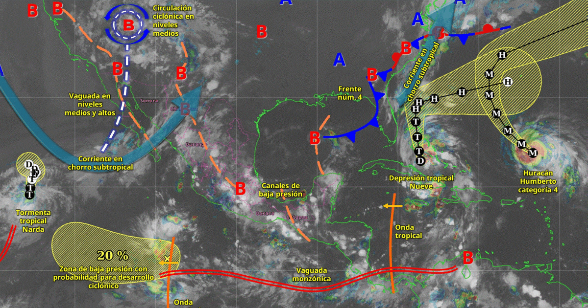 Por otro lado, el huracán Narda mantendrá oleaje elevado en la costa occidental de la península de Baja California, con olas de hasta tres metros.