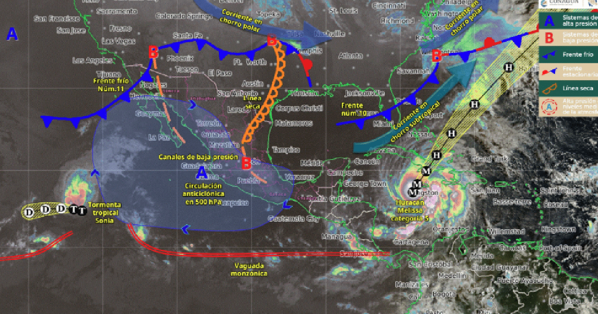 La masa de aire polar asociada al frente generará marcado descenso de las temperaturas, con posibles heladas en sierras del norte y noreste del país. Por su parte, canales de baja presión sobre el interior del territorio nacional, en combinación con el ingreso de aire húmedo del océano Pacífico, golfo de México y mar Caribe, originarán intervalos de chubascos en estados del occidente, centro, oriente, sur y sureste de la República Mexicana, incluyendo la península de Yucatán. Una circulación anticiclónica en niveles medios de la atmósfera mantendrá baja probabilidad de lluvias en el noroeste, norte y centro del territorio nacional. Finalmente, se pronostica durante la madrugada del miércoles, evento de “Norte” muy fuerte a intenso con rachas de 85 a 100 km/h y oleaje de 2.0 a 3.0 metros de altura en la costa norte de Tamaulipas.