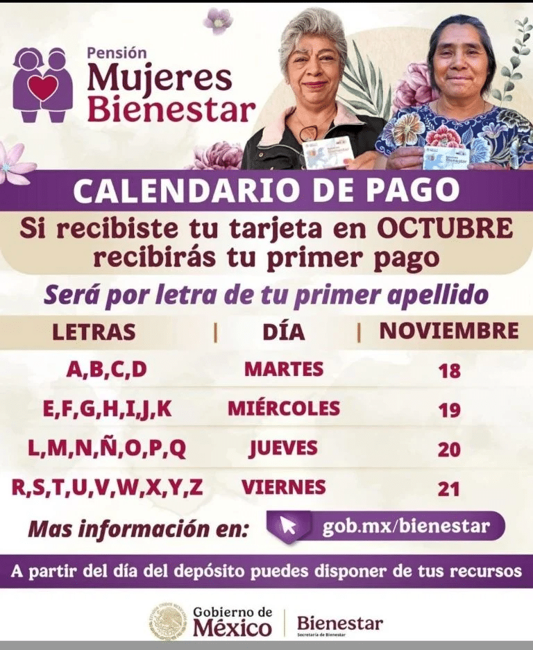Las mujeres de 60 a 64 años que recibieron su tarjeta en octubre ya podrán cobrar su primer pago de la Pensión Mujeres Bienestar entre el 18 y el 21 de noviembre, de acuerdo con la inicial de su primer apellido.