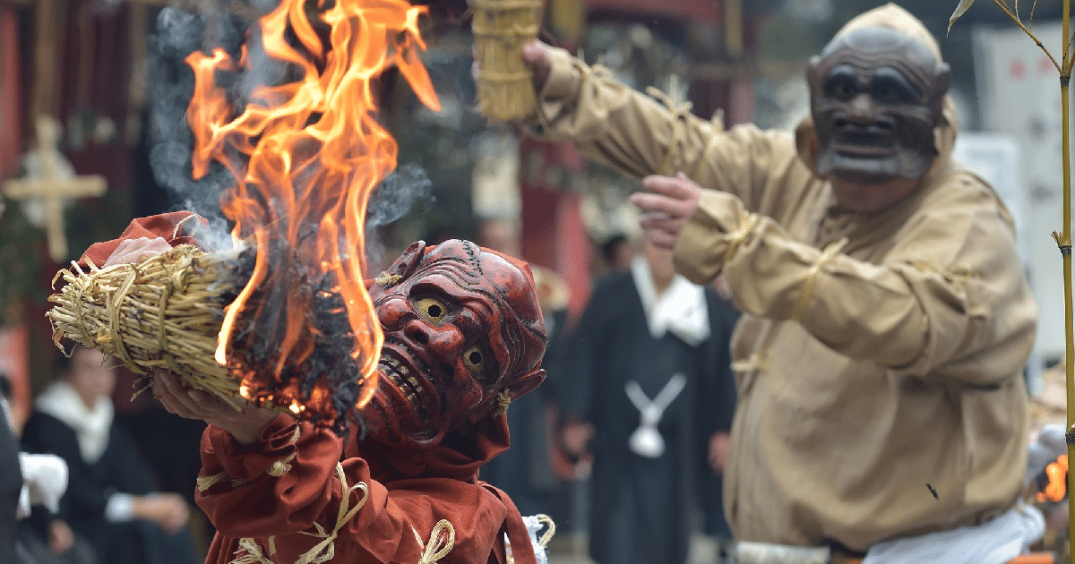 El ejemplo más difundido es Setsubun, la festividad del cambio de estación donde familias y templos celebran el rito del mamemaki —lanzar frijoles tostados mientras se grita “¡Oni wa soto! ¡Fuku wa uchi!” (¡Fuera demonios! ¡Dentro la buena fortuna!)— como forma de purificación colectiva y de arranque afortunado del nuevo ciclo agrícola. Esta práctica, con raíces en cortes imperiales y en transformaciones medievales, sigue viva en templos y hogares en todo Japón.