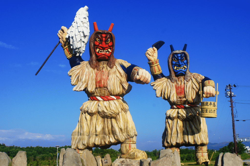 En el extremo norte, las figuras llamadas Namahage son una versión local del encuentro ritual con “demonios”: durante Año Nuevo, hombres en máscaras de oni y capas de paja descienden de las montañas para visitar casas, reprender malos comportamientos (sobre todo de niños) y traer bendiciones y alimentos. Aunque su aspecto intimida, la finalidad social es disciplinaria y protectora: limpiar la comunidad de pereza o negligencias y asegurar prosperidad. Estudios etnográficos y museos locales detallan cómo la máscara-oni funciona aquí como instrumento de cohesión social.
