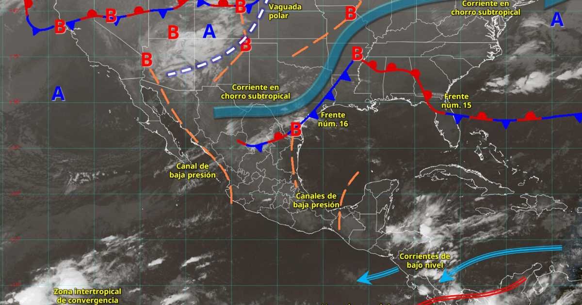Para hoy, el frente núm. 16 se extenderá sobre el norte y noreste de México, y en interacción con la corriente en chorro subtropical y con un canal de baja presión, ocasionará lluvias puntuales fuertes con descargas eléctricas en Nuevo León y Tamaulipas, así como chubascos en Coahuila y San Luis Potosí.
