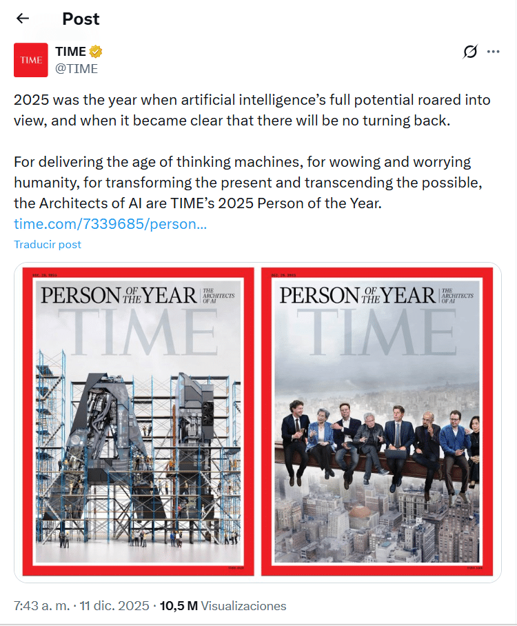 La revista estadounidense Time nombró a los llamados “Arquitectos de la Inteligencia Artificial” como Persona del Año 2025, en reconocimiento al papel decisivo que han tenido en el desarrollo y expansión global de la inteligencia artificial durante este año.