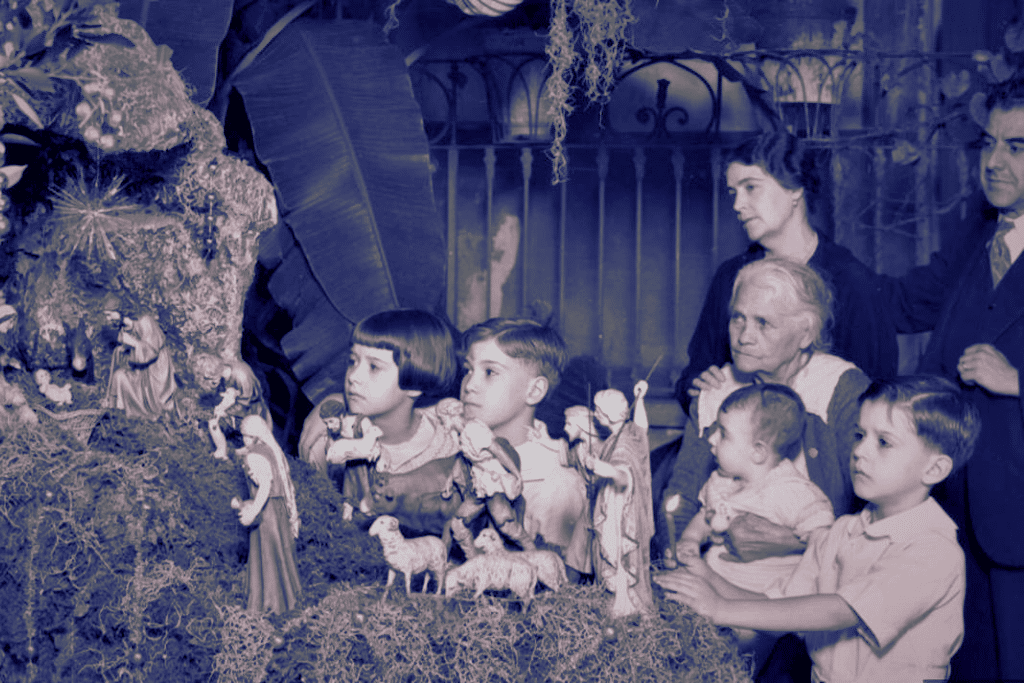 Los villancicos se cantaban en coro mientras la familia se reunía alrededor del nacimiento, decorado con elementos artesanales, musgo y figuras de barro hechas por artesanos locales.