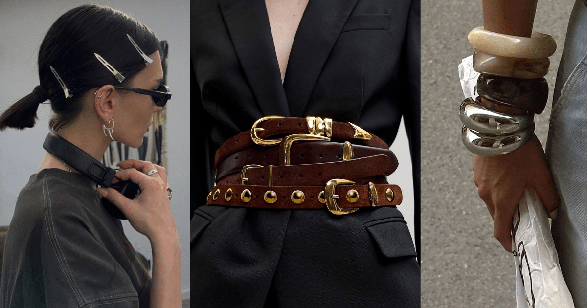 El regreso de los accesorios de cabello en general, pero sobretodo de broches vistosos, y cinturones de bolsos, o muchos al mismo tiempo, es una de las grandes notas de estilo para 2026. Los broches artesanales o con formas atrevidas se ven en capas múltiples, mientras que los cinturones anchos, corsés o con detalles llamativos redefinen siluetas.