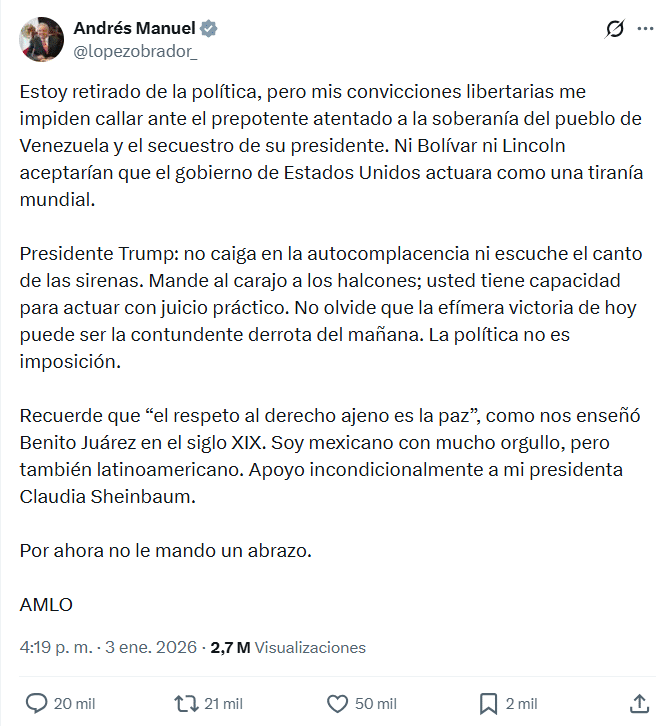 En su mensaje, publicado desde su retiro de la vida política, López Obrador calificó la operación estadounidense como un “prepotente atentado a la soberanía del pueblo de Venezuela” y describió la detención de Maduro como un “secuestro” por parte de las fuerzas de Estados Unidos. El exmandatario afirmó que figuras históricas como Simón Bolívar y Abraham Lincoln jamás habrían aceptado una acción de ese tipo por parte de otra nación.