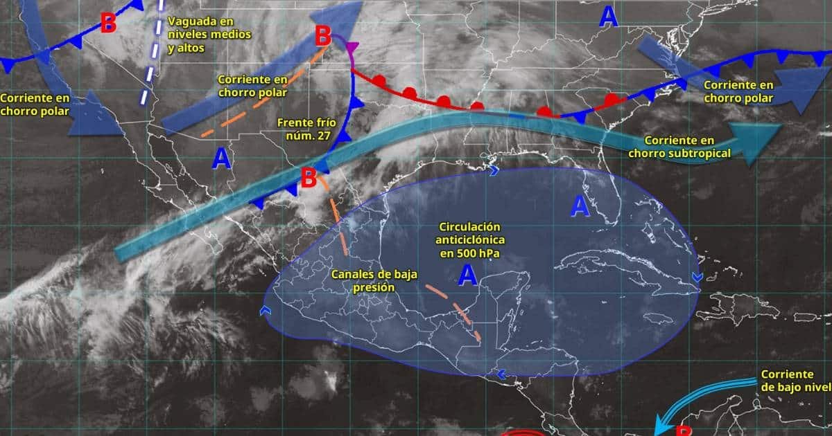 Para hoy, el frente frío núm. 27 recorrerá el norte y gradualmente el noreste del territorio nacional en interacción con un canal de baja presión, una vaguada en niveles medios y altos de la atmósfera y con las corrientes en chorro polar y subtropical, lo que generará lluvias y chubascos en Sonora y Chihuahua.
