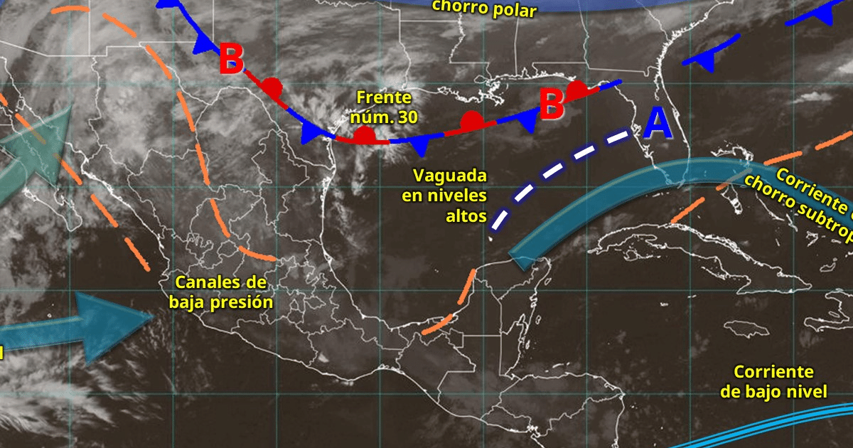 Por otra parte, el frente núm. 30 se extenderá sobre el noreste mexicano, y se prevé que por la tarde-noche, sea reforzado por una masa de aire ártico y en interacción con el ingreso de humedad generará lluvias y chubascos en el noreste del país; así como viento de componente norte con rachas de 50 a 70 km/h y posible formación de torbellinos o tornados en el norte de Coahuila. El ingreso de humedad proveniente del océano Pacífico, golfo de México y mar Caribe, generará lluvias y chubascos en el sur y sureste del país, incluida la península de Yucatán.