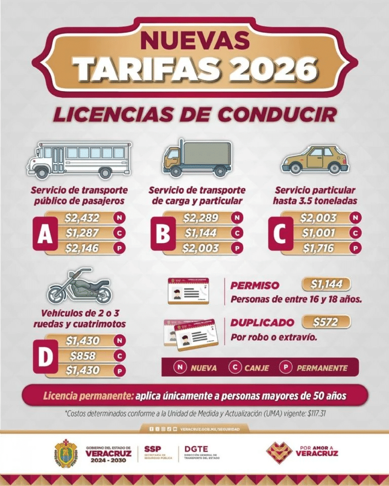 La licencia de conducir en Veracruz registró nuevos precios en febrero de 2026 tras el aumento de la UMA; los costos van de 1,430 a 2,432 pesos según el tipo.