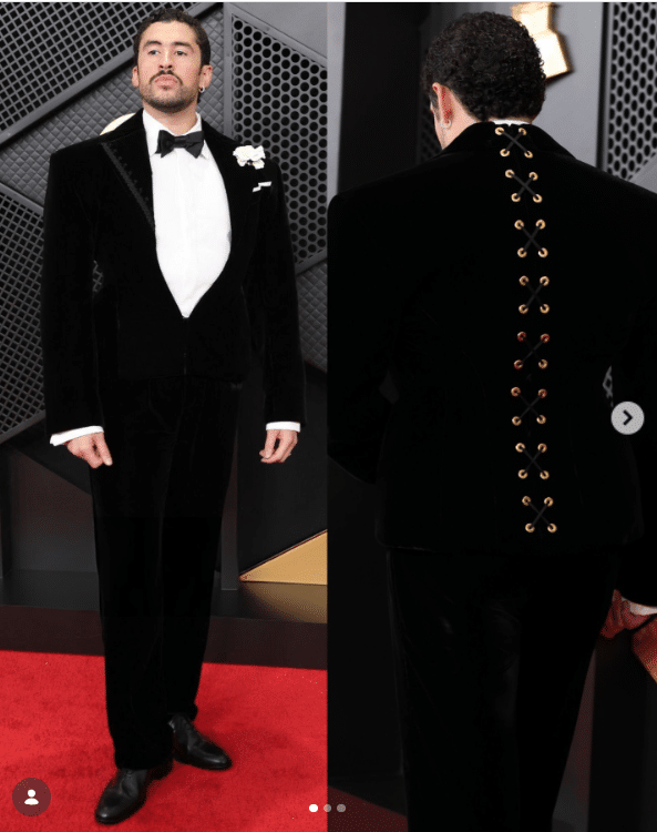 Bad Bunny se convirtió además en el primer hombre en vestir Schiaparelli en una alfombra roja de esta magnitud, luciendo una chaqueta de terciopelo negro con detalles artesanales, camisa de piqué blanco y pajarita de satén negro.