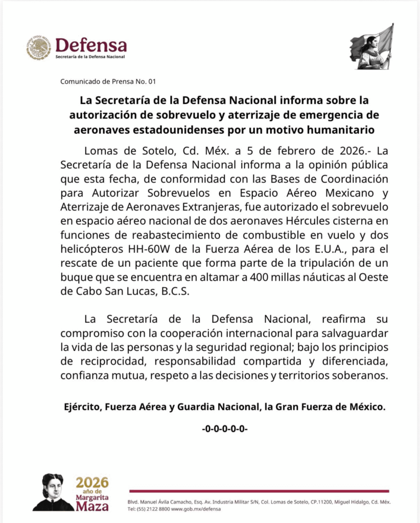 La noche del 5 de febrero de 2026, la Secretaría de la Defensa emitió un comunicado oficial informando sobre la autorización concedida para que aeronaves de los Estados Unidos ingresen al espacio aéreo mexicano. Esta decisión, lejos de ser un tema político, responde a una misión crítica de ayuda humanitaria para salvar a un tripulante en alta mar.