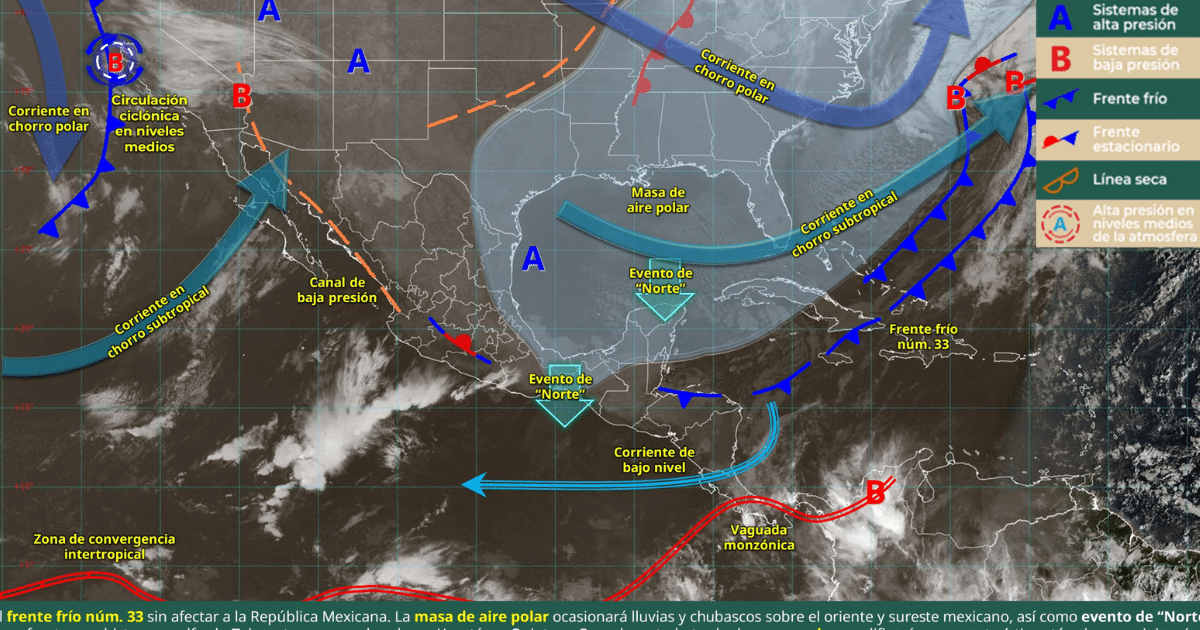 Este día, el frente frío núm. 33 se extenderá sobre el mar Caribe, dejando de afectar a la República Mexicana; sin embargo, la masa de aire polar asociada cubrirá el noreste, centro, oriente y sureste de la nación, incluida la península de Yucatán, ocasionando lluvias y chubascos sobre el oriente y sureste mexicano.