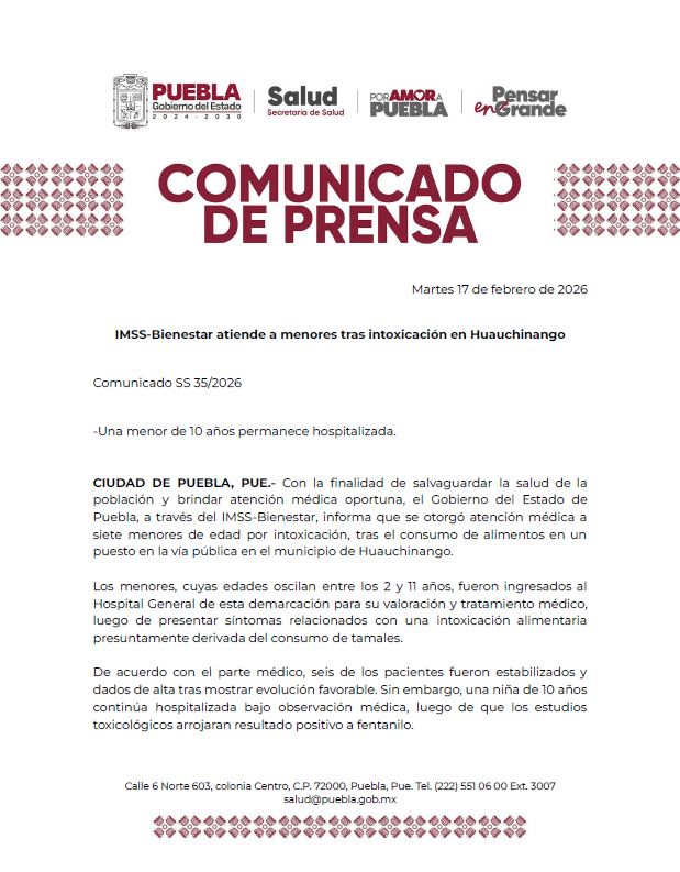 Siete menores de entre 2 y 11 años resultaron intoxicados el 14 de febrero en Huauchinango, Puebla, tras consumir tamales en un puesto de la colonia El Potro; una niña dio positivo a fentanilo y permanece hospitalizada, mientras la Fiscalía investiga cómo ocurrió la contaminación.
